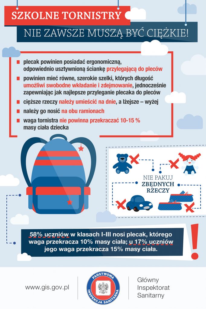 • wybierz tornister z szerokimi szelkami i usztywnioną ścianką przylegającą do pleców,